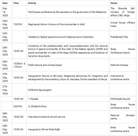 According to the schedule of activities for the 2023 Presidential Inauguration released by Secretary Mustapha, the President-Elect will be awarded the highest national honor of Grand Commander of the Order of the Federal Republic (GCFR) on May 25 in preparation for his inauguration on May 29.