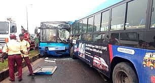 The incident occurred on the Lagos-Abeokuta Expressway, near Danco Filling Station, when one bus swerved to avoid a commercial motorcyclist who was illegally using the BRT corridor, resulting in a collision with another bus.