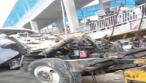 Our correspondents gathered on Thursday that a low bed truck crashed into a nearby pedestrian bridge after being hit by the other truck and the driver was seriously injured in the process.